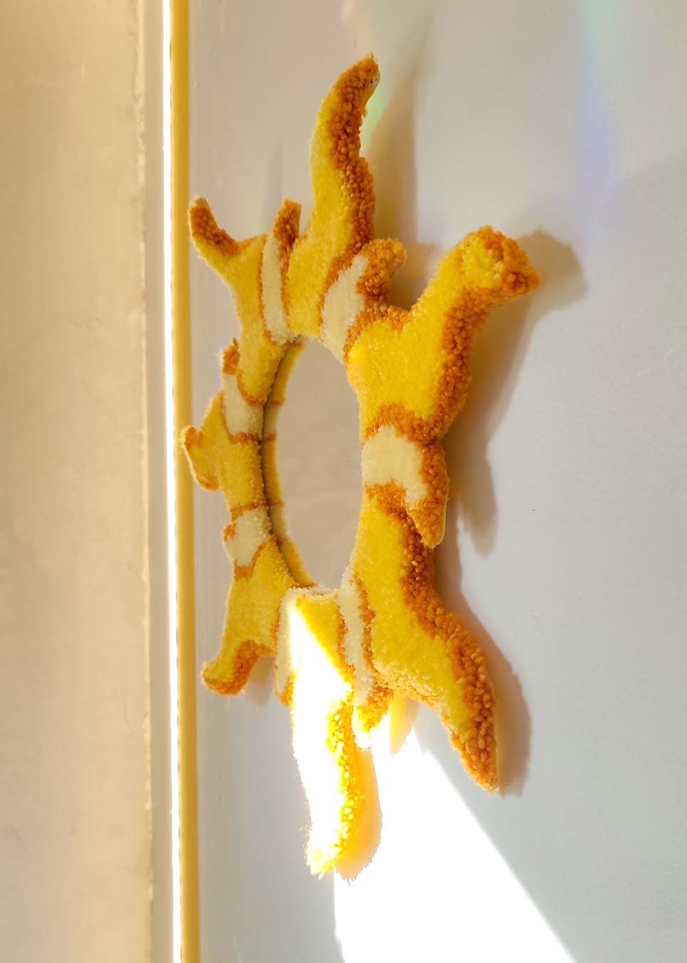 Ce grand miroir tufté aux rayons jaunes et orangés est une pièce solaire qui apporte de la lumière et un brin d’enfance à ton intérieur.