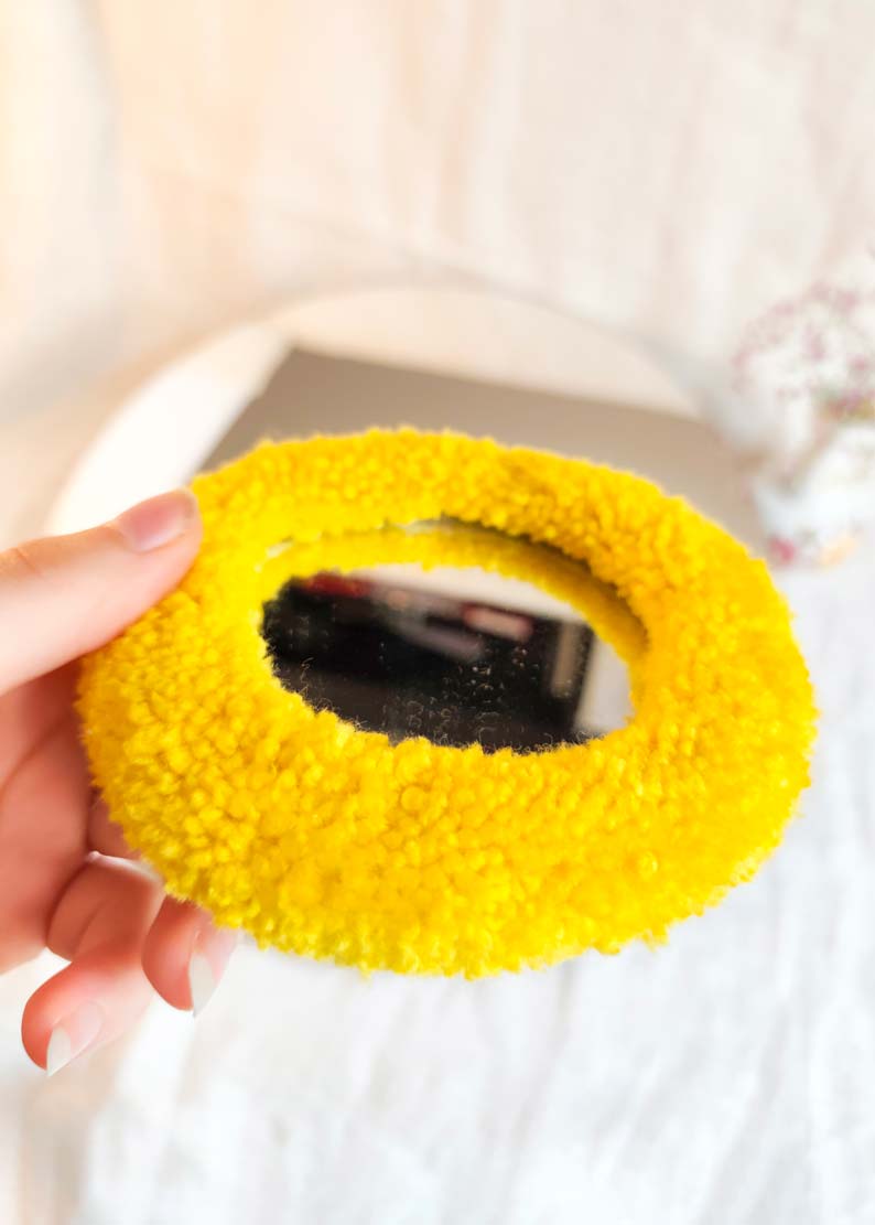 ⏳Le temps de création d’une décoration tuftée varie selon la taille et le niveau de détail du motif : un miroir main demande environ une heure, un miroir mural ou un petit tapis entre 1h30 et 3h.