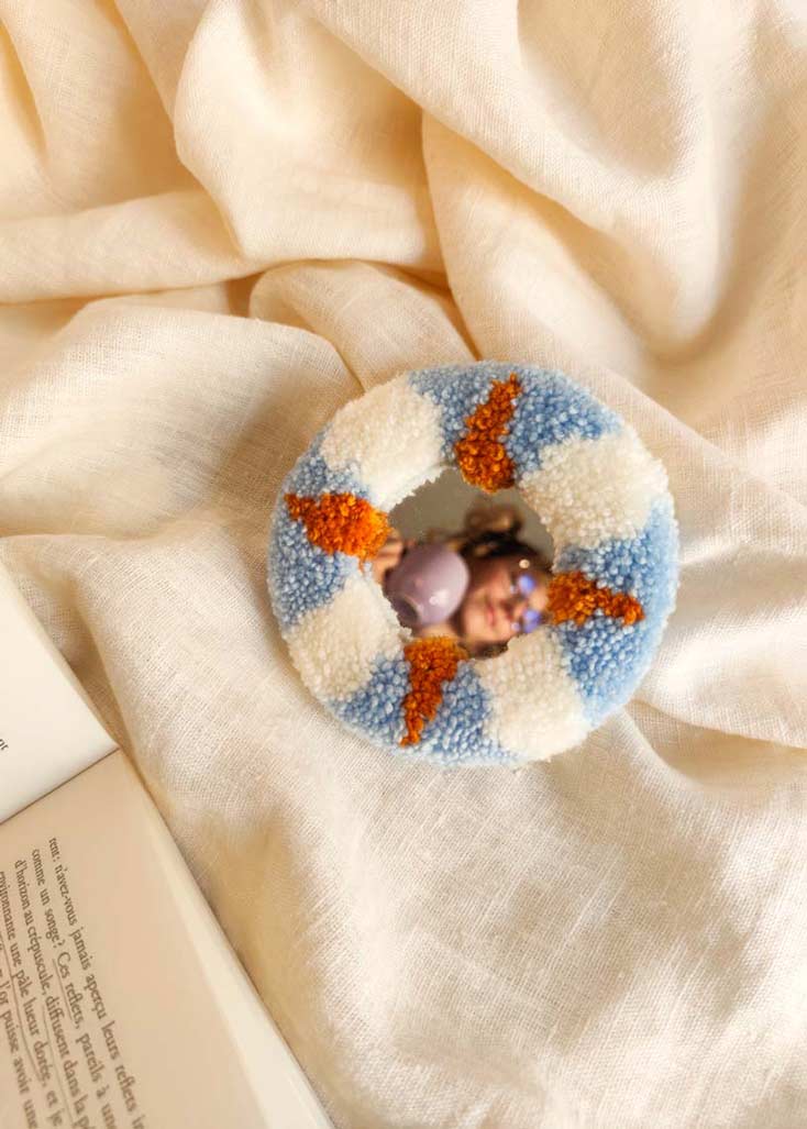 Ce miroir à main tufté s’inspire des motifs granny square en crochet, avec ses fleurs blanches et jaunes sur fond bleu clair.
