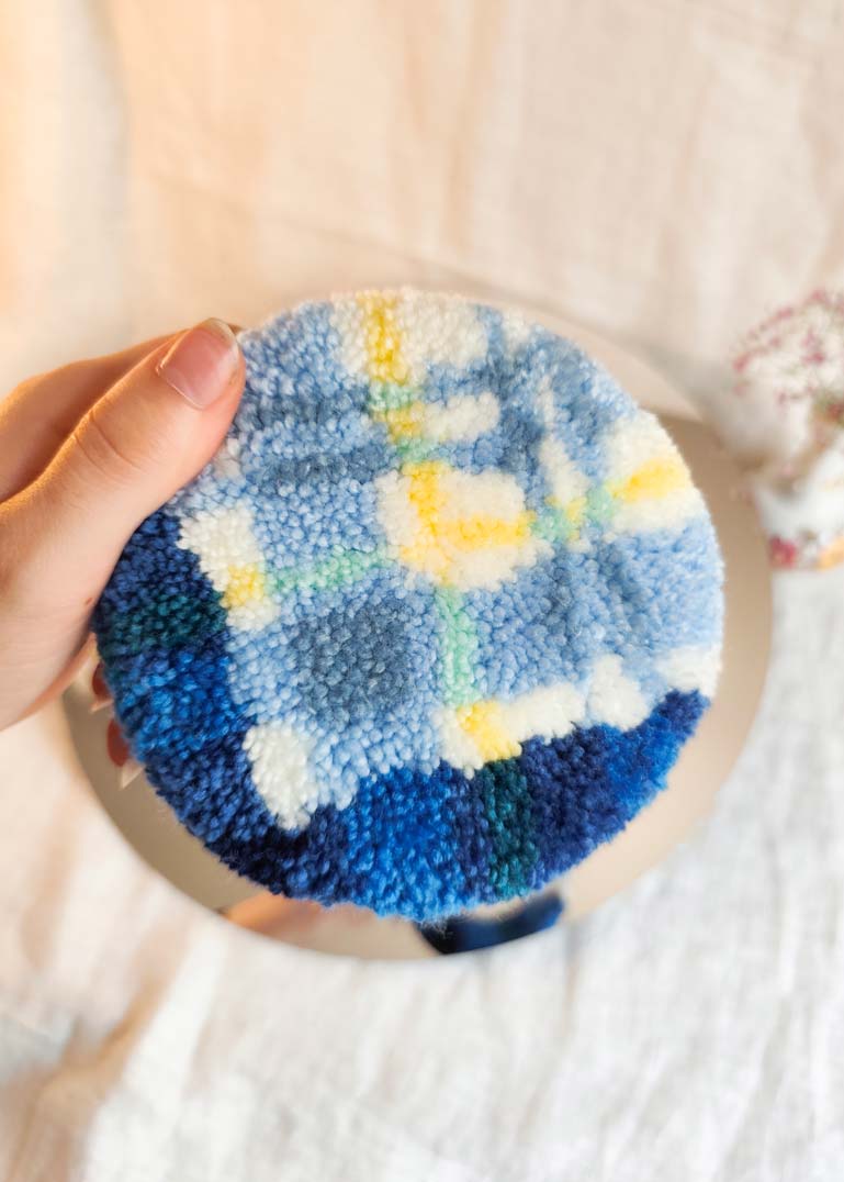 ⏳Le temps de création d’une décoration tuftée varie selon la taille et le niveau de détail du motif : un miroir main demande environ une heure, un miroir mural ou un petit tapis entre 1h30 et 3h.