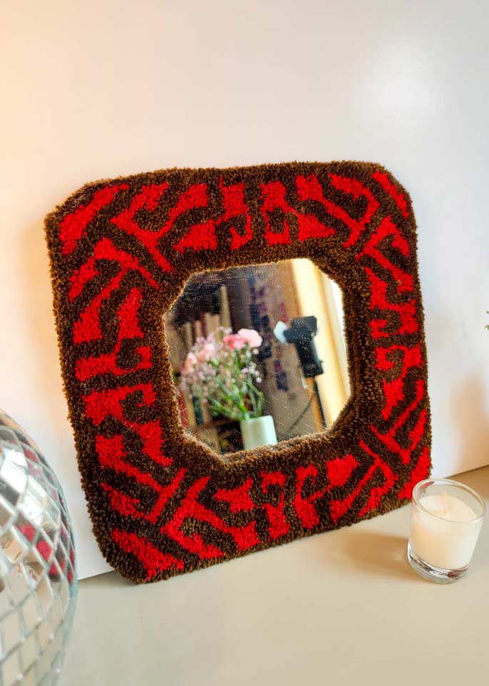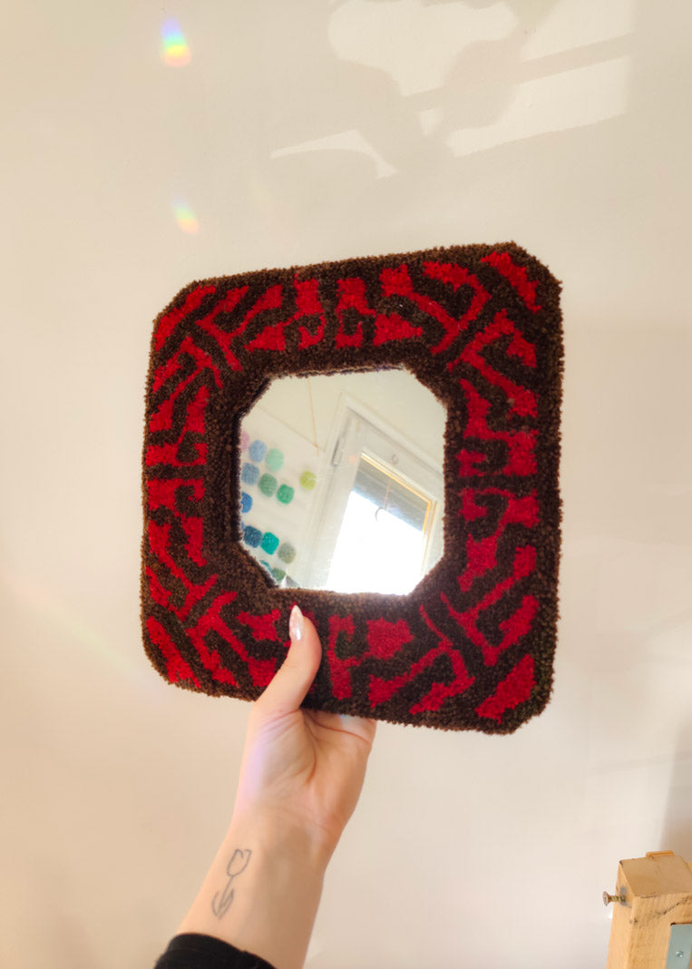 ⏳Le temps de création d’une décoration tuftée varie selon la taille et le niveau de détail du motif : un miroir main demande environ une heure, un miroir mural ou un petit tapis entre 1h30 et 3h.