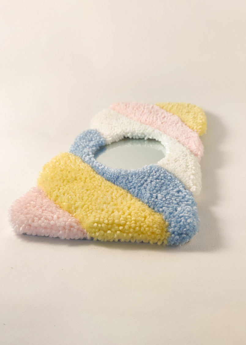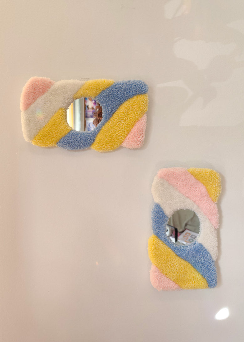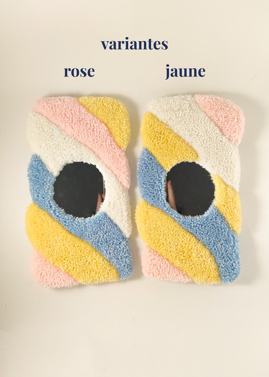 Ce miroir tuftĂ© âguimauveâ, mĂ©lange de rose, bleu et jaune, Ă©voque la gourmandise et la joie des friandises.