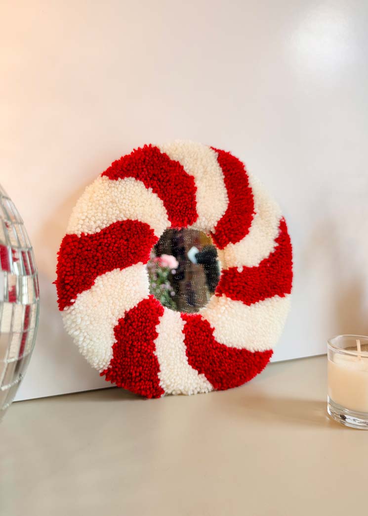 Ce miroir tufté rouge profond, évoquant le sucre d’orge, apporte une touche sucrée et cosy à ton intérieur.