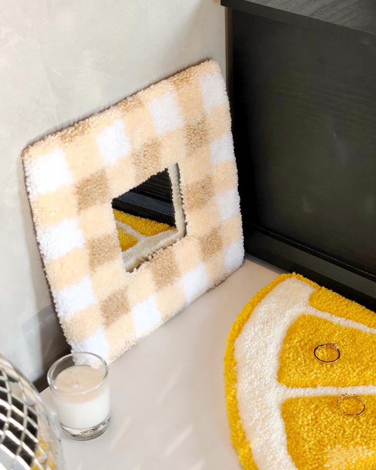 ⏳Le temps de création d’une décoration tuftée varie selon la taille et le niveau de détail du motif : un miroir main demande environ une heure, un miroir mural ou un petit tapis entre 1h30 et 3h.